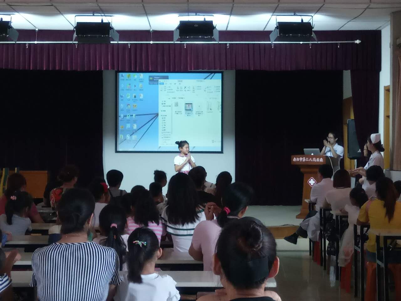在“洗手歌”歡快的歌聲里,我們開(kāi)始了今天的手衛生知識宣傳,隨著(zhù)世界衛生組織手衛生宣傳片的播放,小朋友和家長(cháng)們不再交頭接耳,會(huì )場(chǎng)很快的安靜下來(lái)。之后,醫院感染管理科方姐姐及健康體檢科鮑姐姐來(lái)到講臺,詳細講解并演示了正確的7步洗手法。
